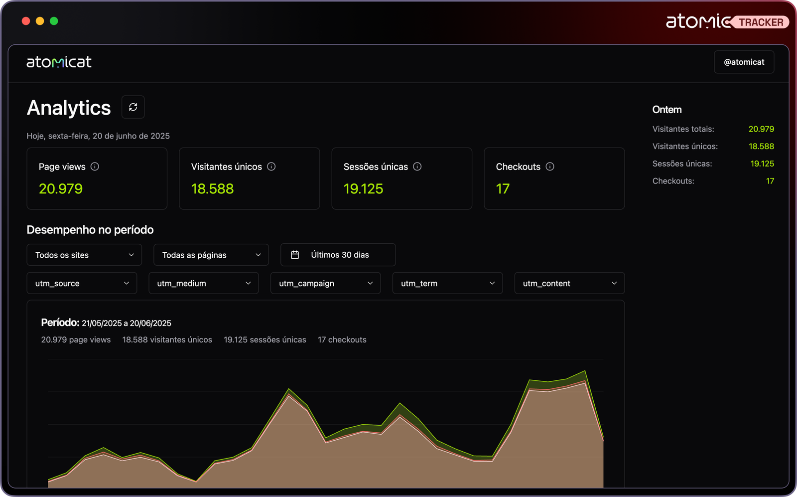 Com o AtomicPixel, você acompanha acessos, cliques, leads, vendas e comportamento dos usuários em tempo real.