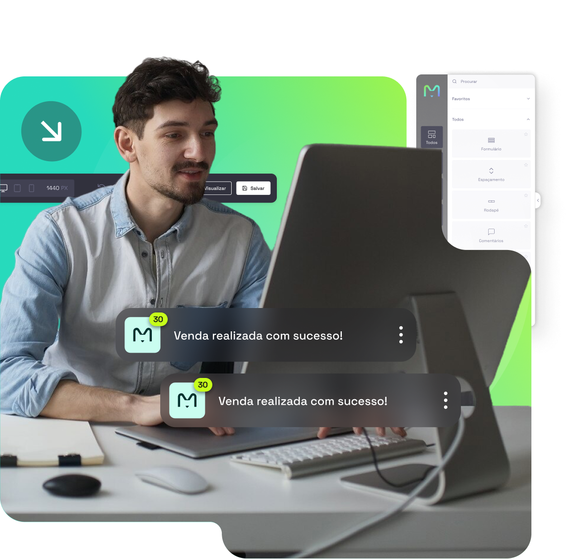 Com nosso editor visual 100% intuitivo, você arrasta e solta os blocos na tela e vê tudo acontecer em tempo real.