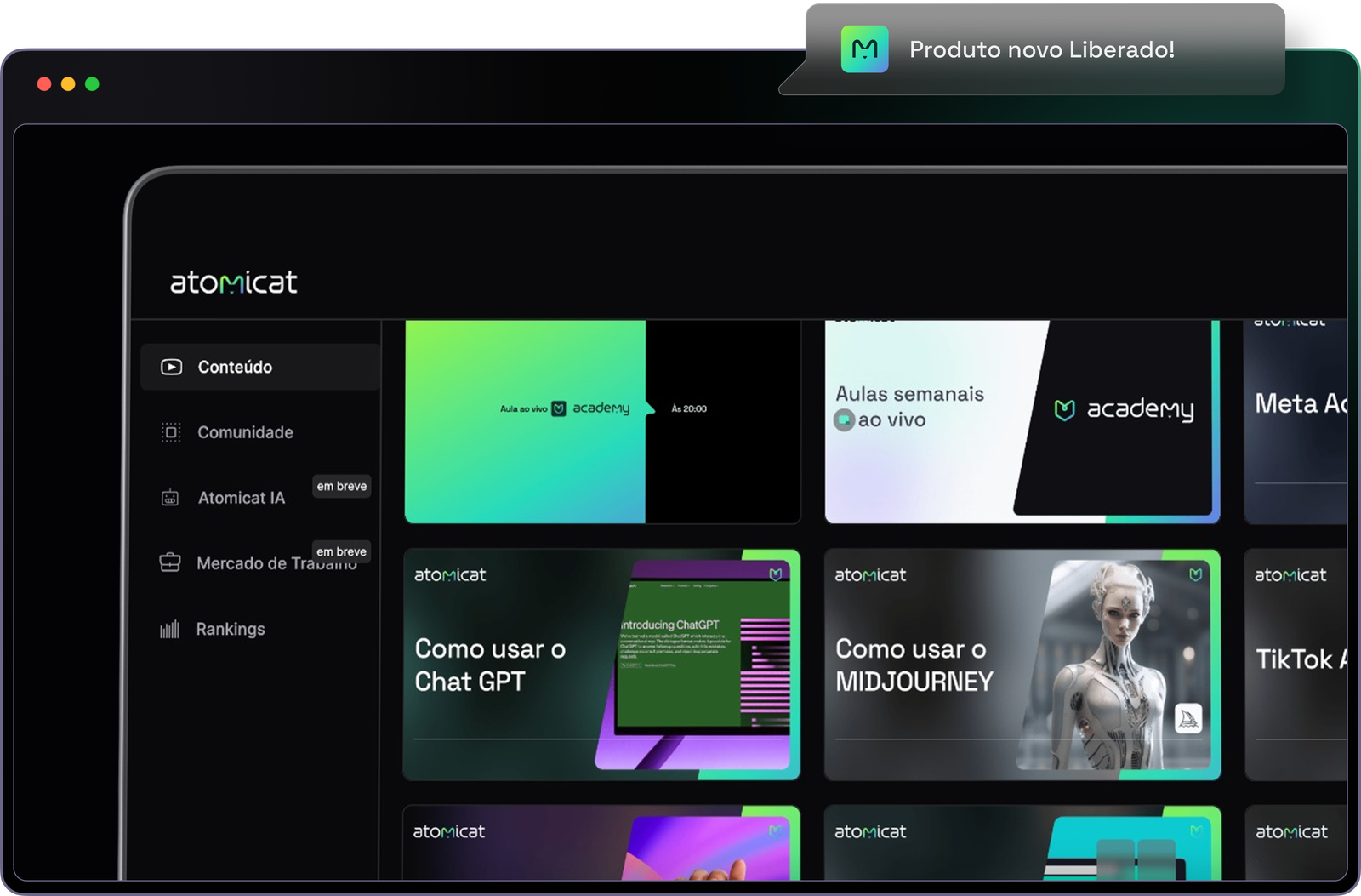 Com a Atomicat, você dá os primeiros passos no digital crie seu negócio online de um jeito simples, rápido e com suporte de verdade.