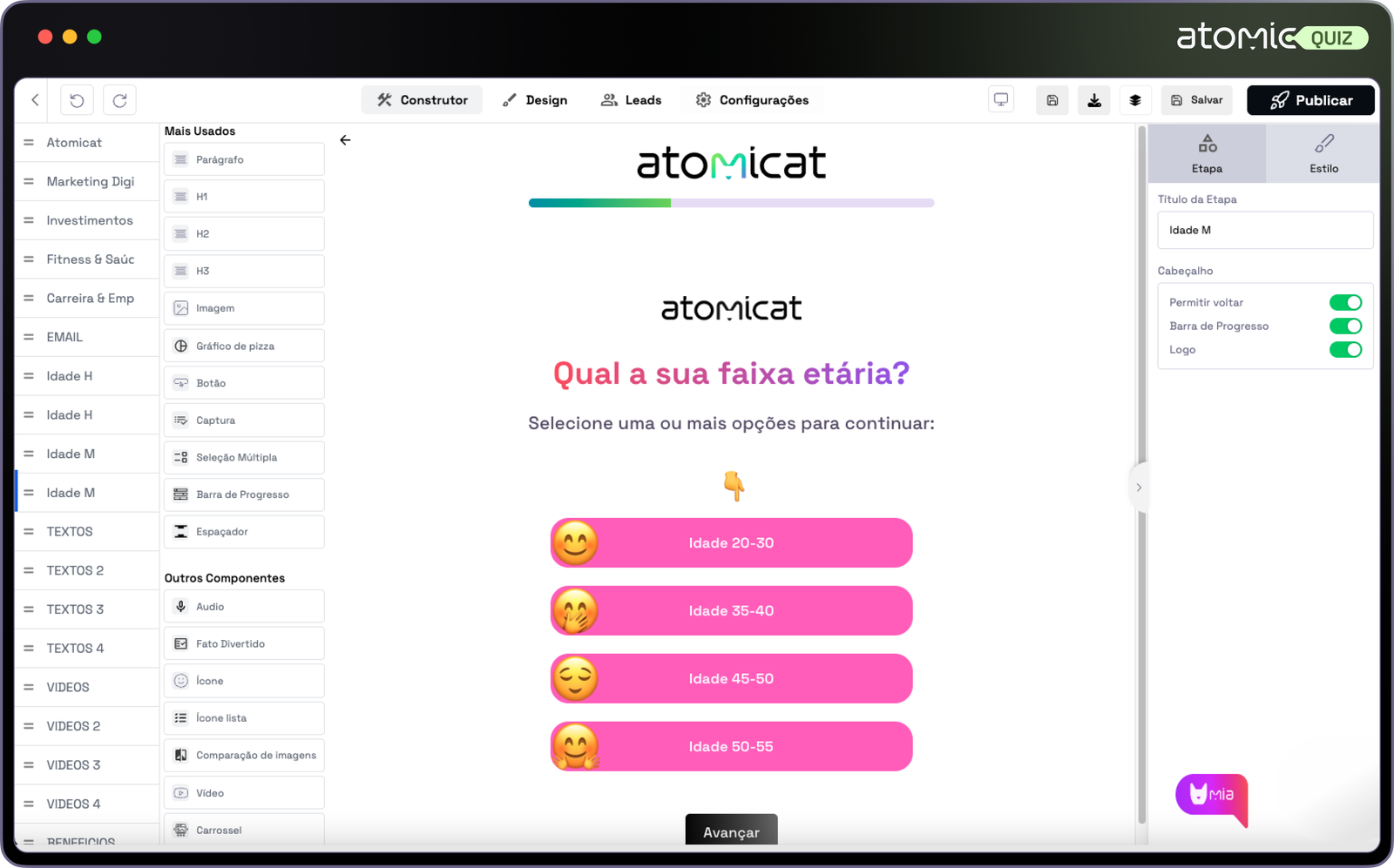 Crie quizzes interativos que qualificam, engajam e convertem. Com o AtomicQuiz você tem uma estrutura simples, leve e altamente envolvente, onde o seu lead responde, se qualifica e chega até sua oferta no estado ideal de compra.